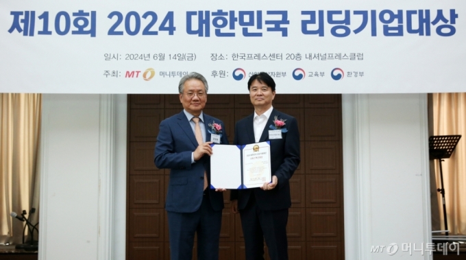 장병대 아이니네트웍스 대표(사진 오른쪽)가 14일 오후 서울 중구 한국프레스센터에서 열린 머니투데이 주최의 '2024 제10회 대한민국 리딩기업대상'에서 '커머스 솔루션' 부문으로 '서비스혁대상'을 수상하고 강호병 머니투데이 대표이사 사장과 기념 촬영 중이다.